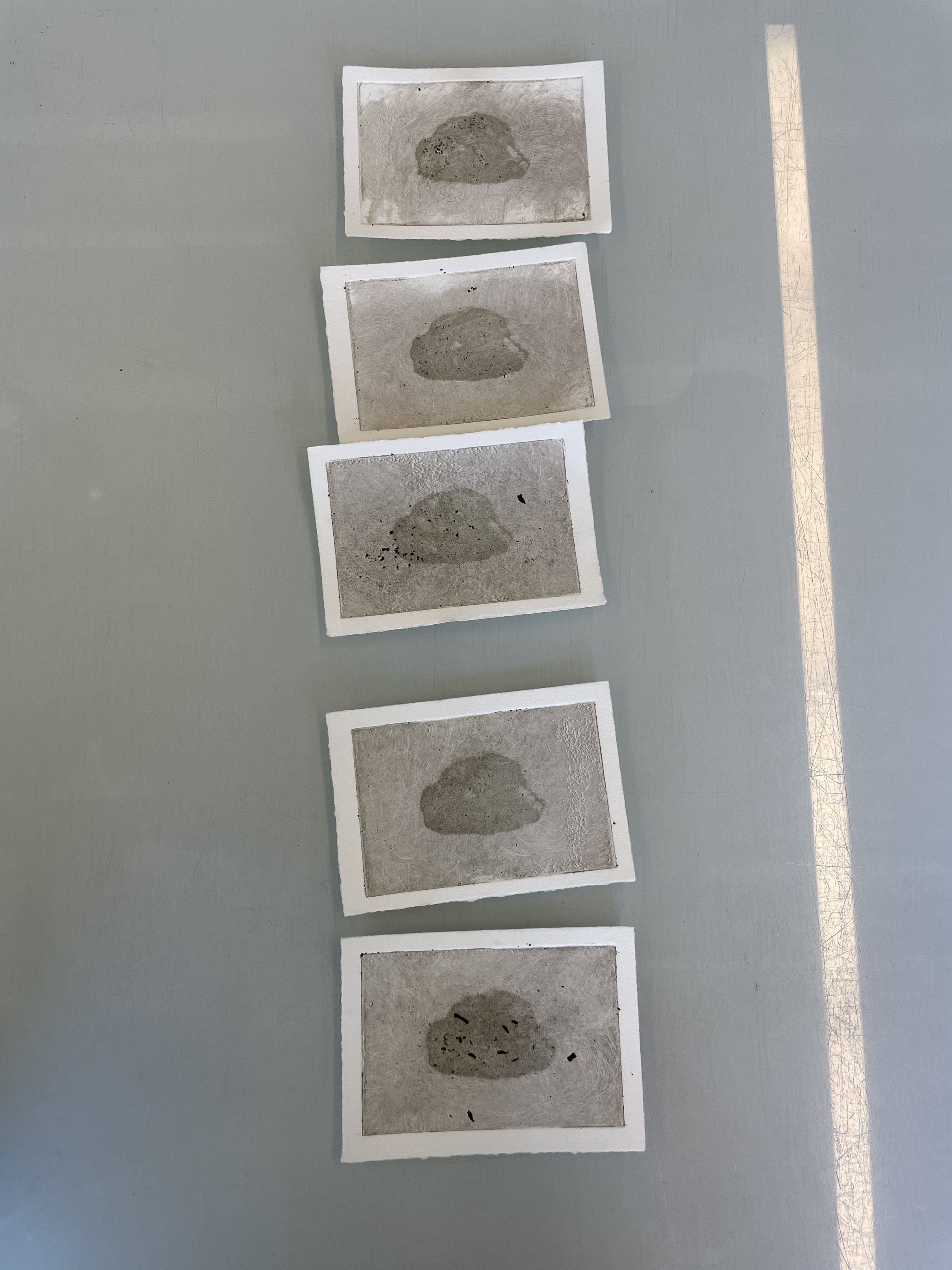 The reciprocity of absence and presence, disappearance and reappearance, is manifest in printing with a matter of physicality, weight and depth, producing traces on the surface of a flattened form. Turning solid rock into powder and mixing it to form ink. The rock-pigmented ink then produces traces of traces in each print, again and again, the traces come back with the imagery that echoes on the plate. Every print is a repetition, yet it is singular, for it is the first and the last time.